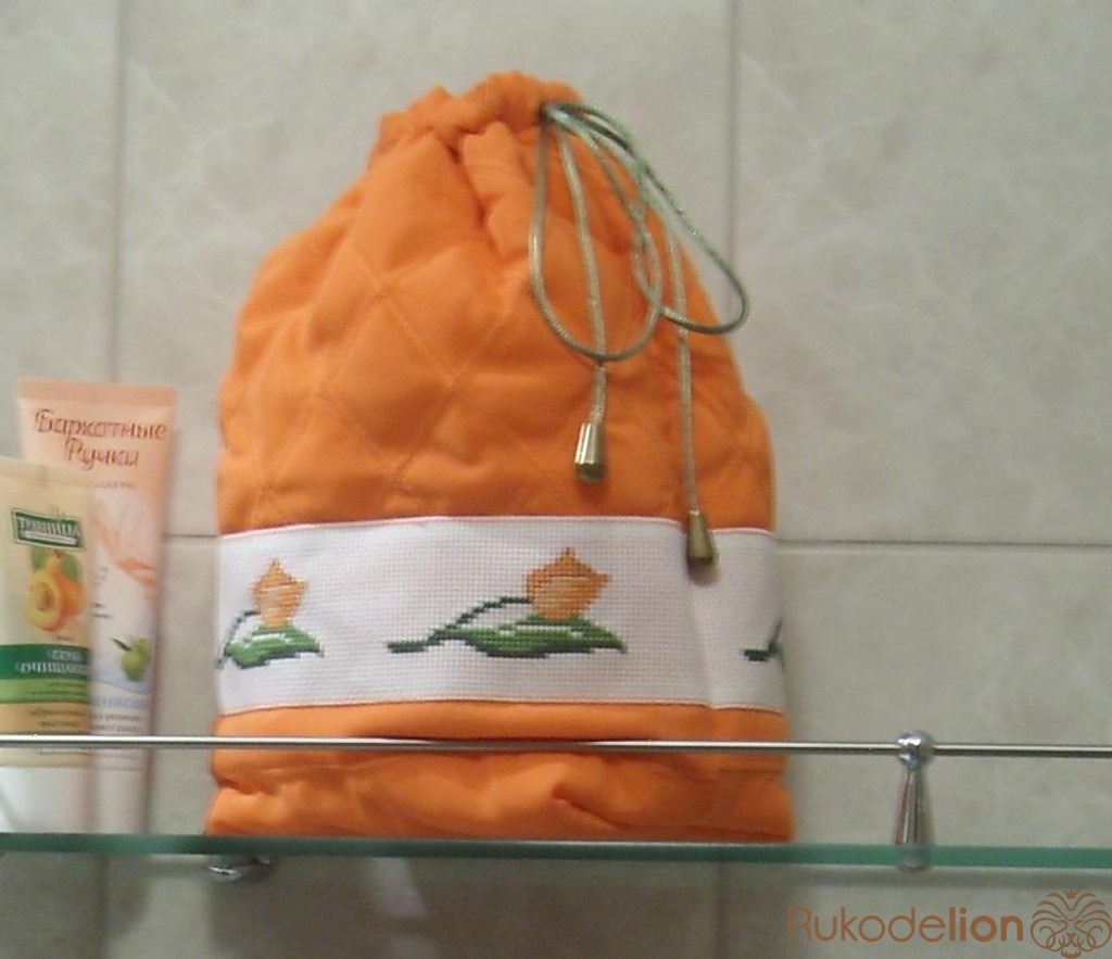 Приметаем и пристрочим тесьму в край. Здесь использована ручная вышивка по канве.