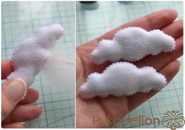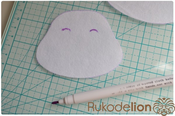 Теперь сделаем глазки. Дыроколом по фетру вырубаем два черных круга - зрачка. Если у вас нет дырокола, то такие круги можно вырезать маникюрными ножницами. Диаметр каждого круга - 5 мм. На синем фетре рисуем два круга диаметром 1 см. Обычно для этого я обвожу какую-нибудь полубусину. В центр каждого синего круга приклеиваем черный и затем вырезаем глаза по нарисованным линиям