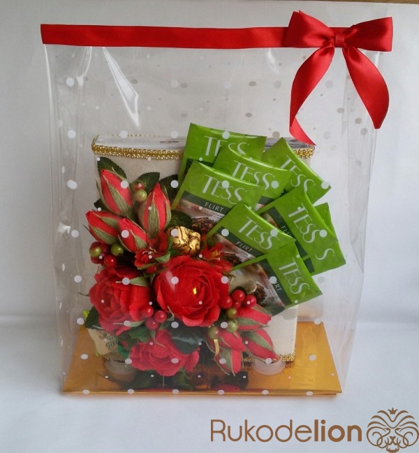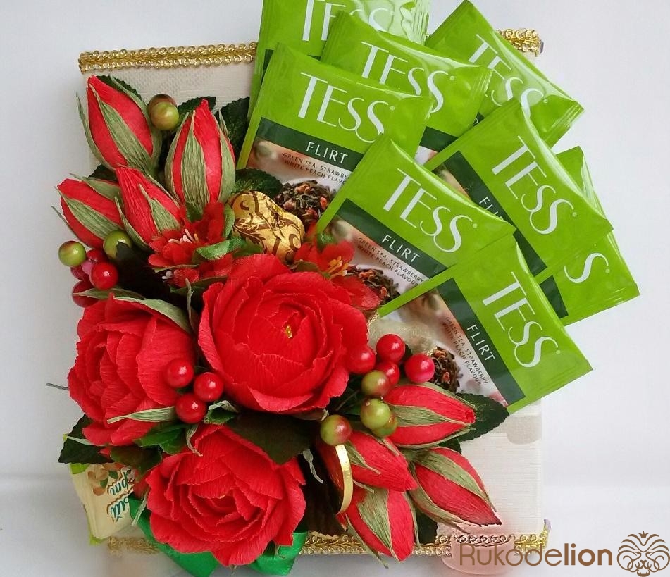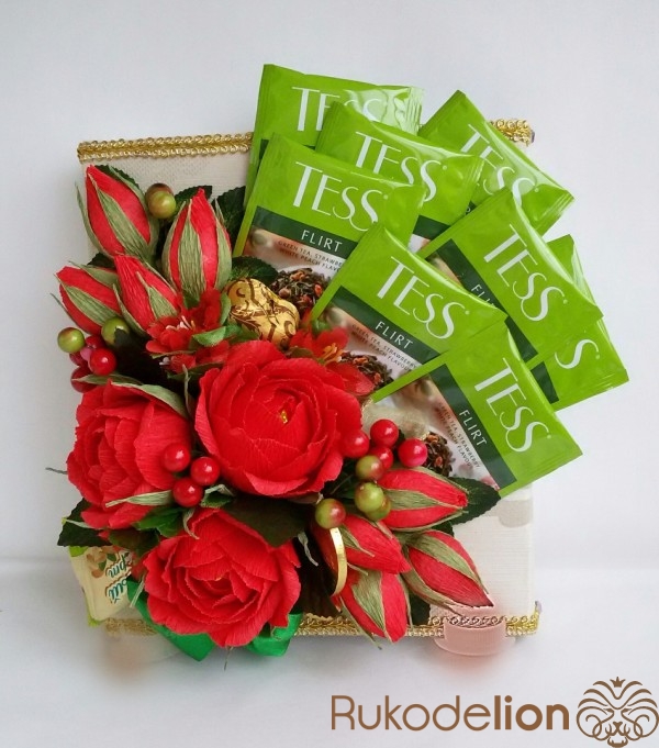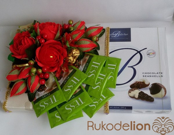 Конфеты шоколадные, бумага гофрированная, лента атласная , чайные пакетики