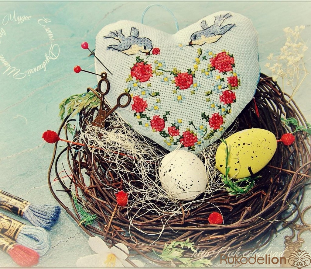 Сердце-подвеска с вышивкой по собственному дизайну "Весенние пташки".