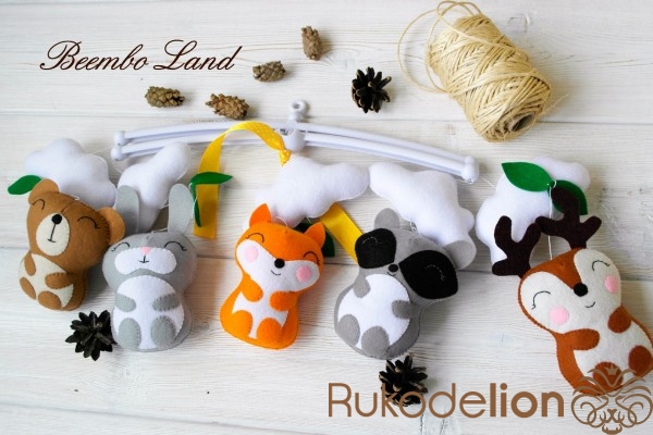Авторский мобиль "Лесные друзья" увлчет малыша в первые месяцы жизни, а в будущем целый игровой набор лесных жителей.