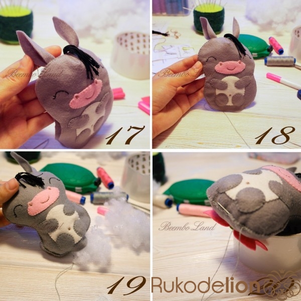 Дошить до низа игрушки, оставить небольшое отверстие и очень плотно набить игрушку наполнителем, оставив при этом, не обрезая рабочую нить.