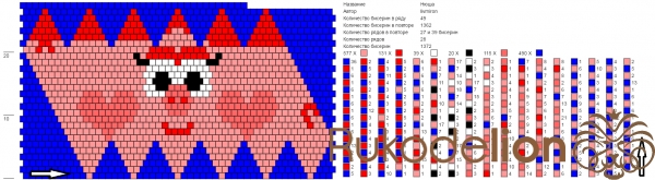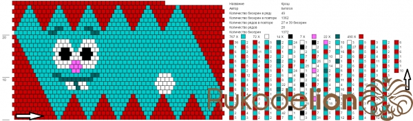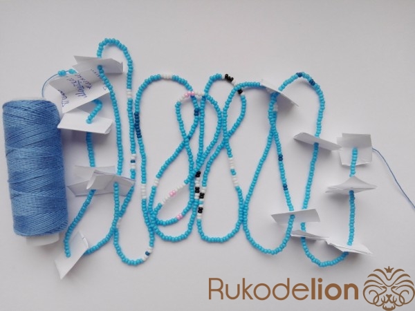 Для начала набираем на нить для вязания бисер. Набор производим или по развертке слева направо снизу вверх, или по рапорту снизу вверх (каждый столбик снизу вверх справа налево), пропуская красный в схеме Кроша или синий в схеме Нюшю. В таком случае вязать мы будем сверху.