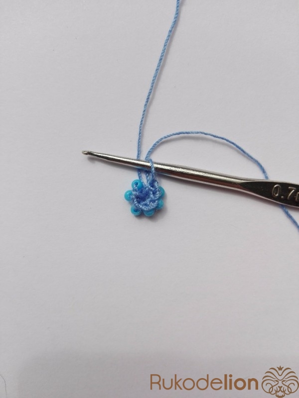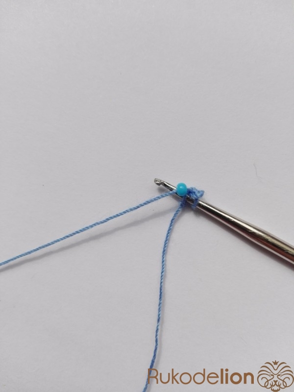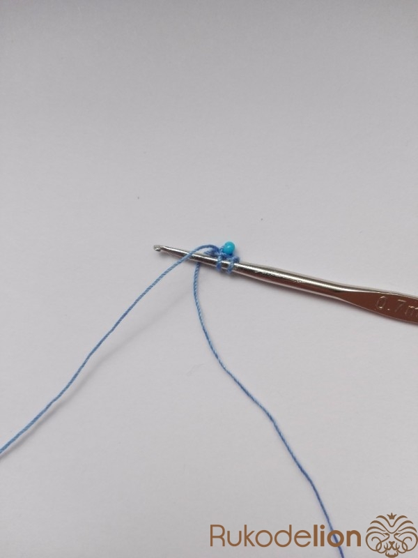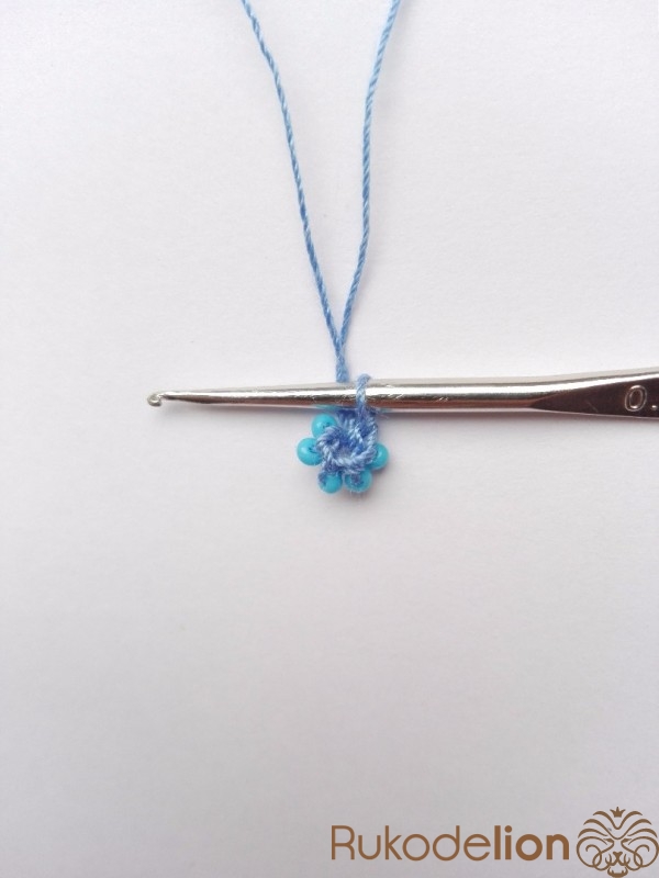 1 ряд. Вводим крючок в первую воздушную петлю. Придвигаем одну бисеринку, захватываем нить за ней и вяжем обычный столбик без накида. Снова вводим крючок в первую воздушную петлю, придвигаем бисеринку и вяжем столбик. Так повторяем аналогичные действия, провязывая еще 4 бисеринки, чтобы получилось 6 бисеринок в круге (6).
