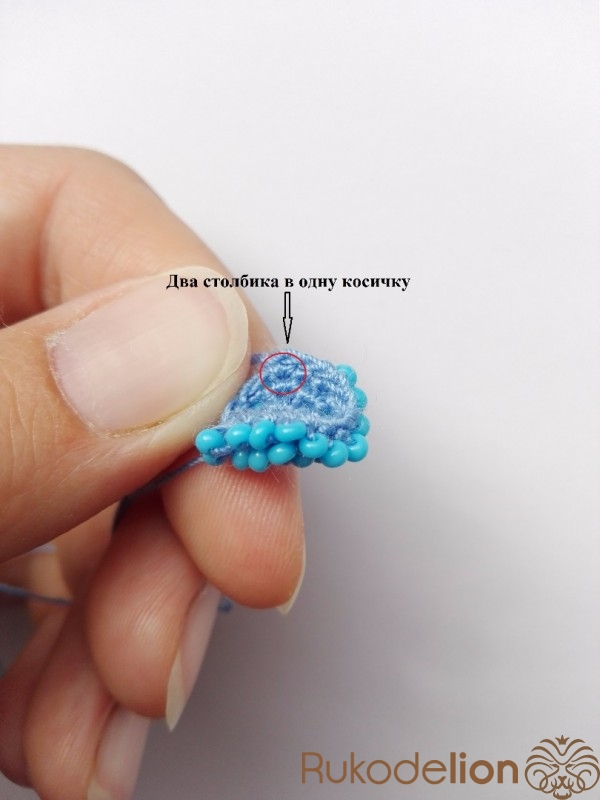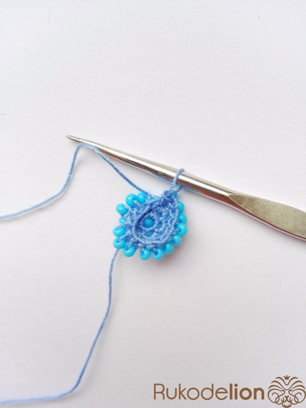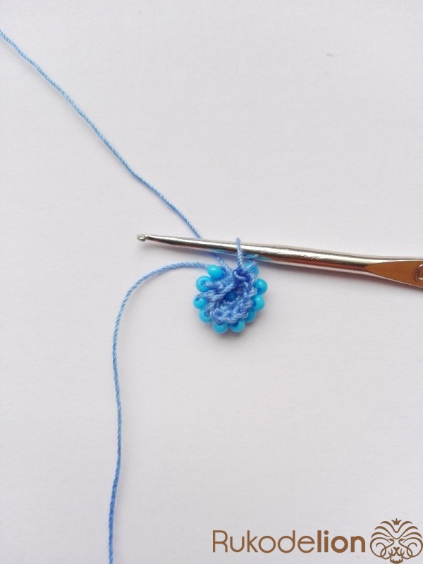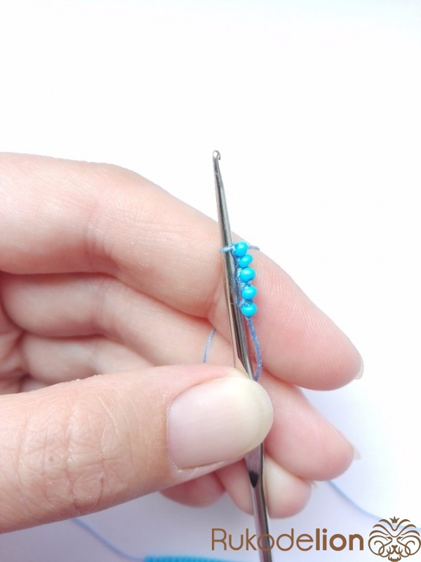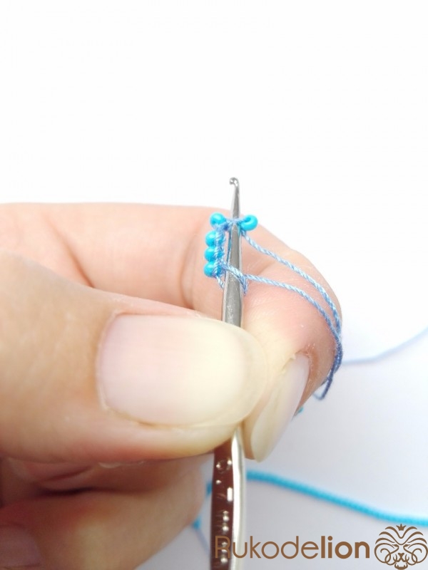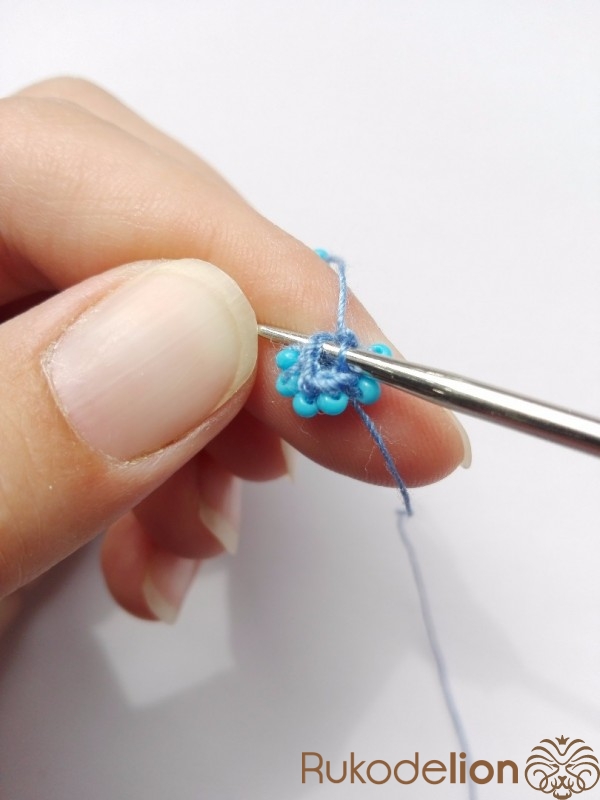 1 ряд - 5 бисерин. После вязания двух воздушных петель в первую петлю провязываем 5 бисерин столбиком.