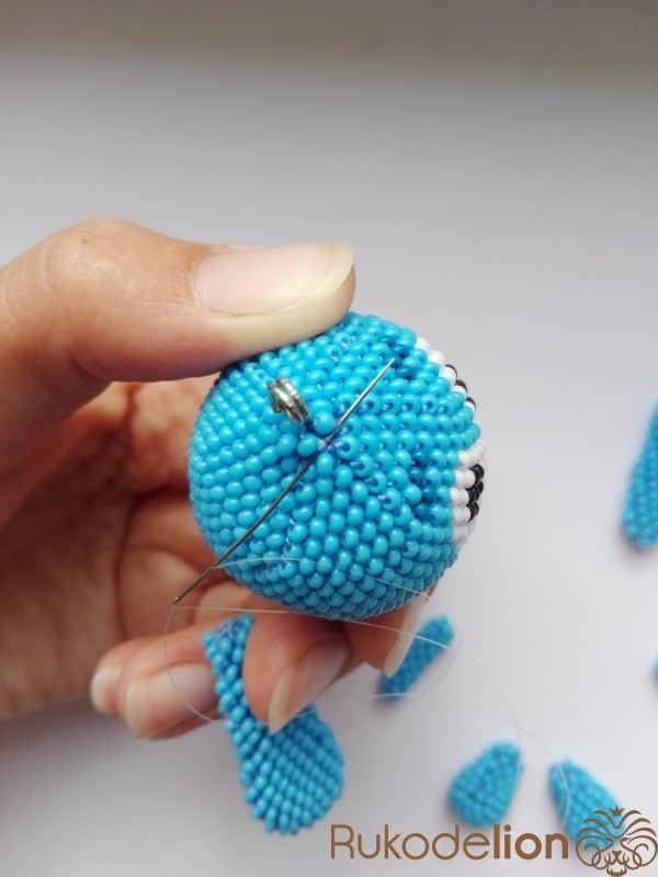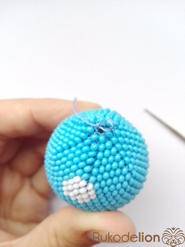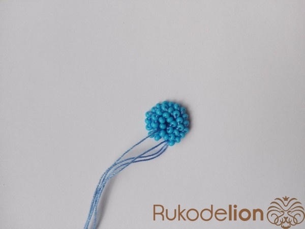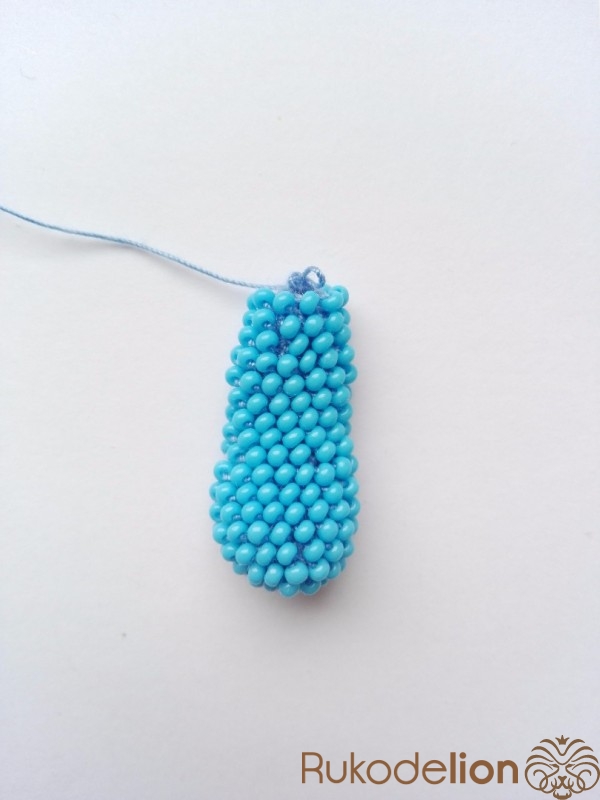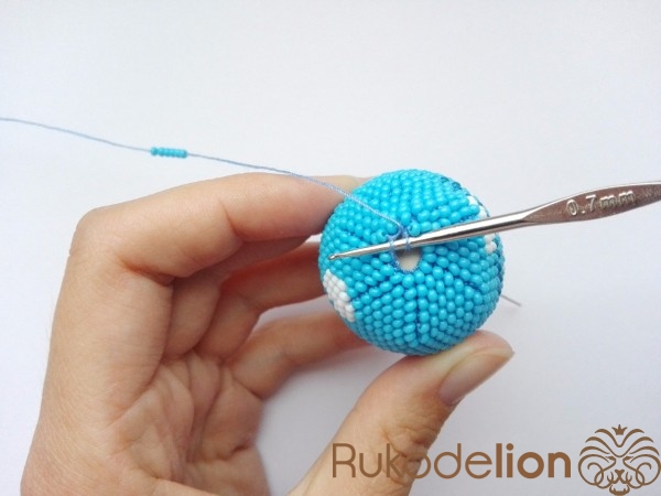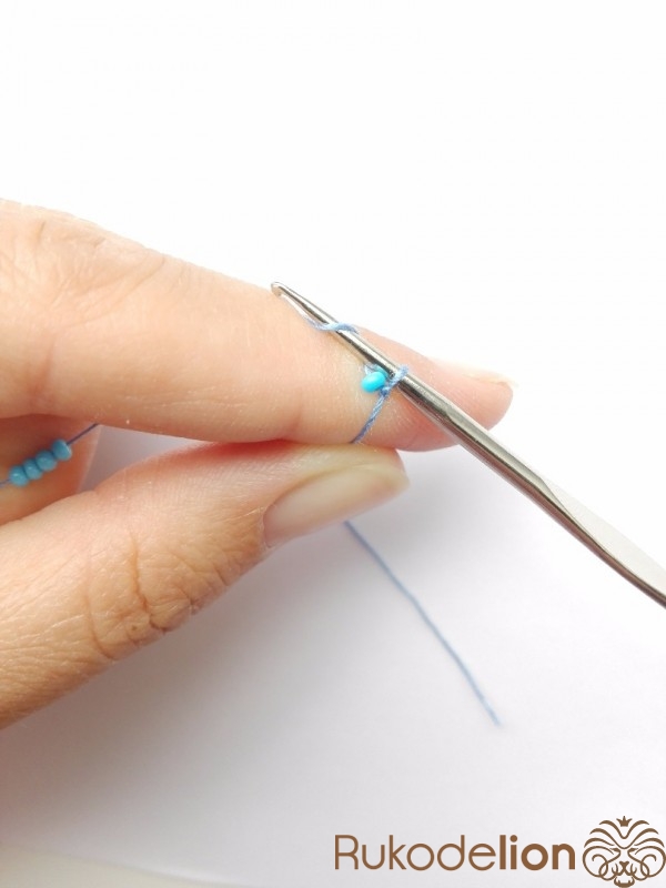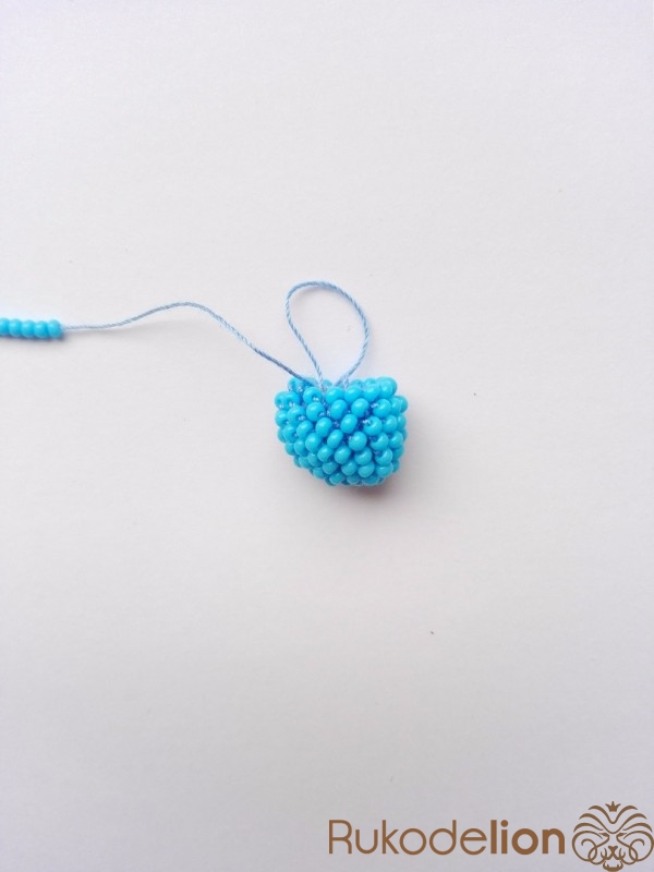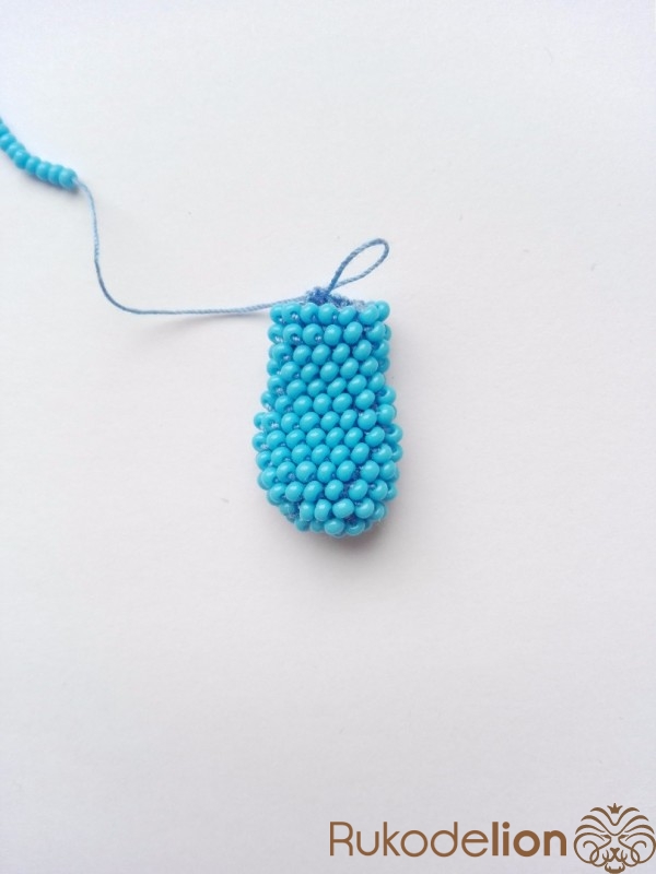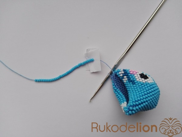 Вяжем ухо. Сначала набираем бисер на нить. Вяжем аналогично шарику, но с некоторыми изменениями.
