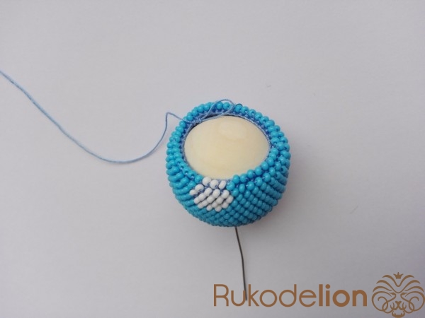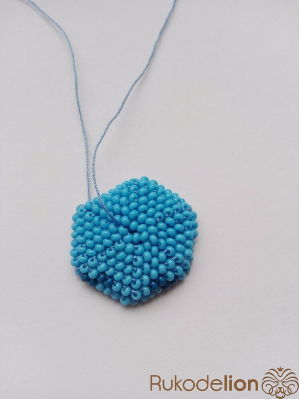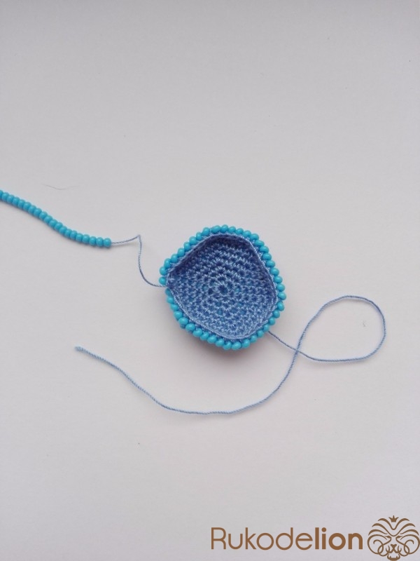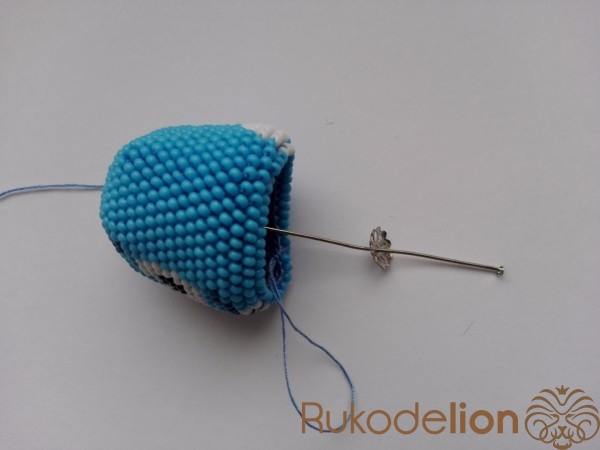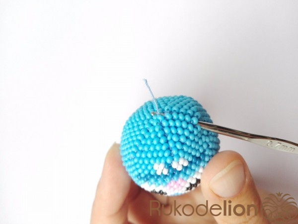 Когда провязали последние 6 бисеринок, отрезаем нить от мотка. Если между этими бисеринками есть небольшая дырочка, то ее можно скрыть, набрав дополнительную бисеринку и провязав ее. Закрепляем нить и прячем в ее в вязании.