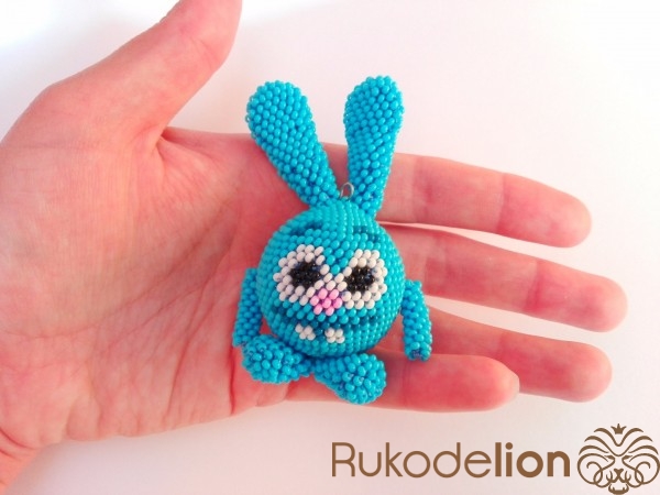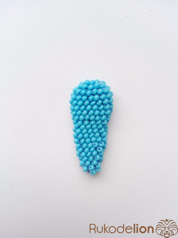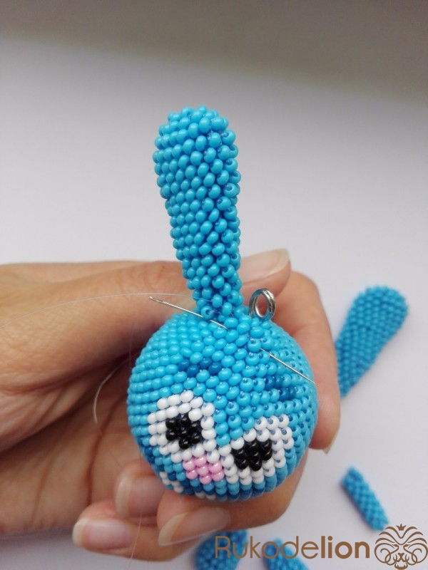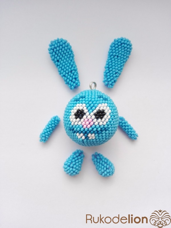 Нижняя лапка вяжется аналогично уху, но короче: 1 ряд - 5 бисерин, 2 ряд - 10 бисерин, 3 и 4 ряды по 15 бисерин, 5 и 6 ряды по 12 бисерин, 7 и 8 ряды по 9 бисерин, 9 и 10 ряды по 6 бисерин, 11 ряд - 3 бисеринки.