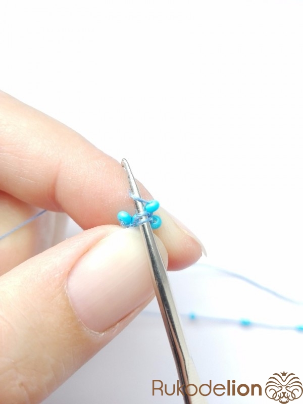 2 ряд - 10 бисерин. Провязываем по две бисеринки в одну петлю.