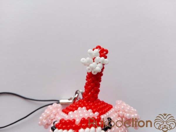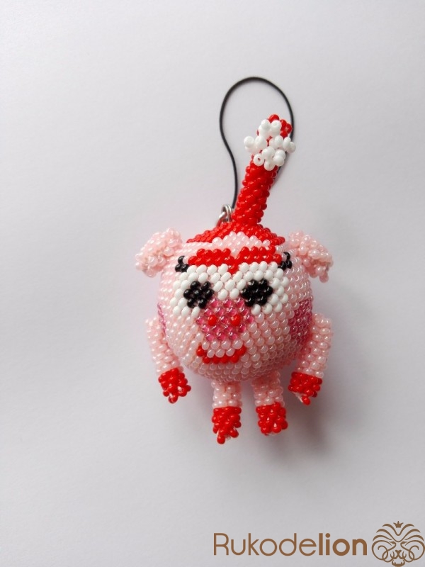 Для Нюши понадобится розовый, малиновый, красный, черный и белый бисер и розовая нить. Бусина набирается и обвязывается аналогично Крошу.