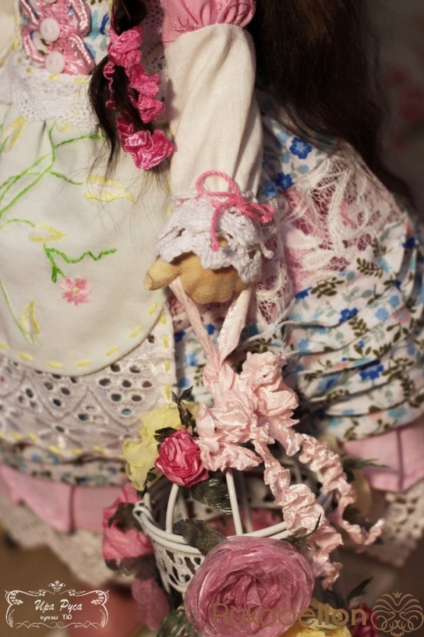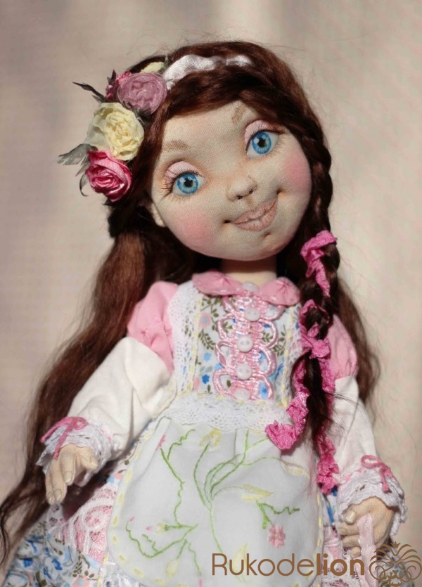 Ладушка - авторская текстильная куколка, сшита из, снаружи обтянута трикотажем. Личико тонировано сухой пастелью и расписано акриловыми красками по ткани, глаза имеют натуральный блеск. Голова поворачивается и наклоняется. Тело куколки также тонировано сухой пастелью. Волосы - мягкие локоны козочки, легко расчесываются, прическу можно менять.