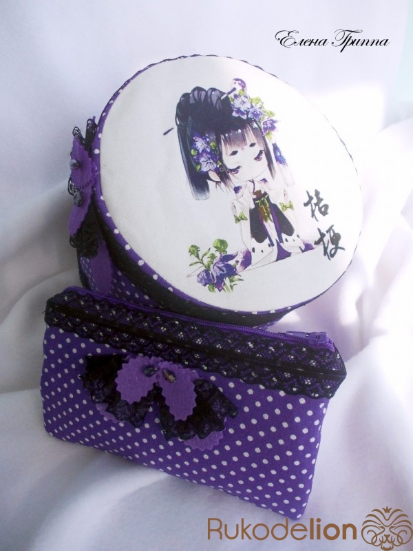 Шкатулка для хранения разных девичьих мелочей и очечник (косметичка, пенал). Размеры: высота шкатулки 13 см, диаметр 17 см; очечник 17*11 см. Материалы: бязь, печать на холсте, фетр, синтепон, переплетный картон, кружево, бисер. Выполнена на заказ, показана для примера. Возможно выполнение в другом цвете, с другим принтом.