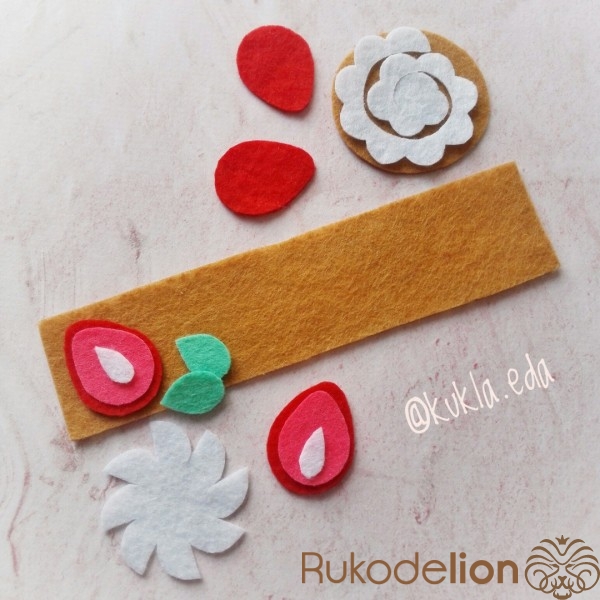 Вырезаю детали согласно выкройке. Для клубничек, бизе и розочек использую жесткий фетр. Сам Кексик можно вырезать и из мягкого фетра.