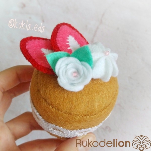 Кексик с клубничкой из фетра готов. Для более интересной игры шью 2-3 Кексика, отдельно Бизешки и несколько Макаронс. В итоге получаю прекрасные наборчики фетровых угощений.