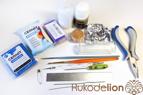 - запекаемая полимерная глина темно-синего, белого, фиолетового цвета;