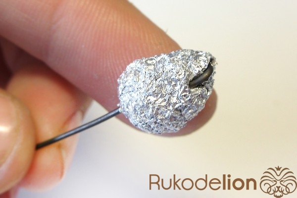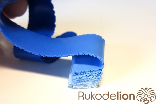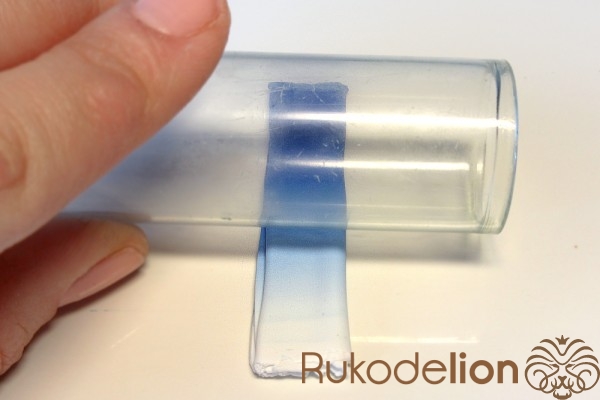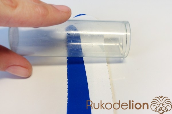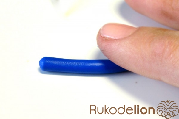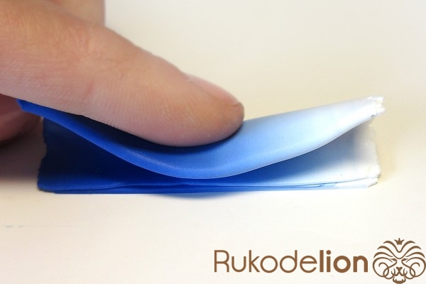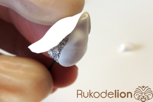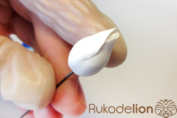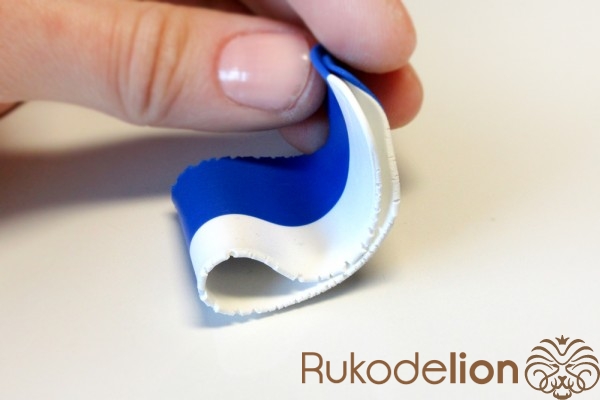 Далее заготовку осторожно вытяните в длину, равномерно сжимая ее пальцами по всей дине и растягивая в стороны, стараясь при этом не повредить ее прямоугольную форму. Теперь к белой стороне детали приложите спицу или толстую проволоку вдоль и начните загибать белые края в сторону спицы, чтобы она оказалась внутри детали.