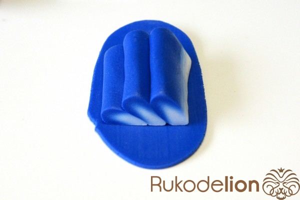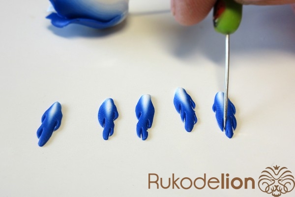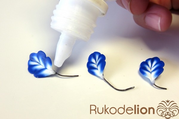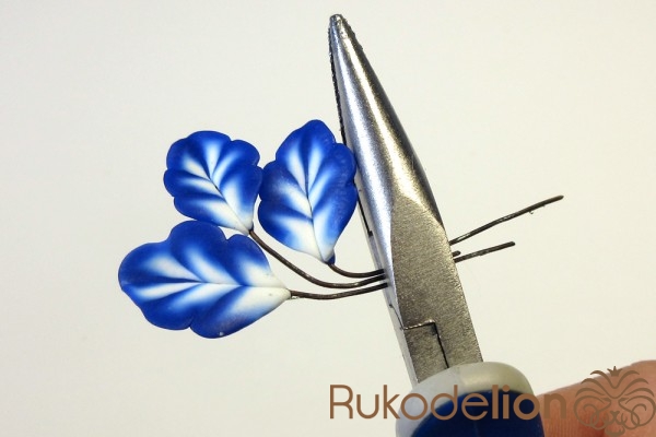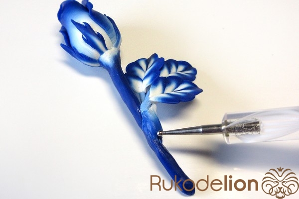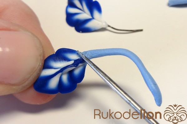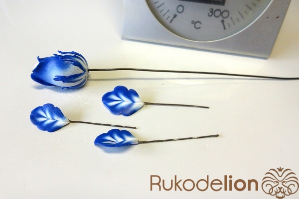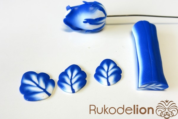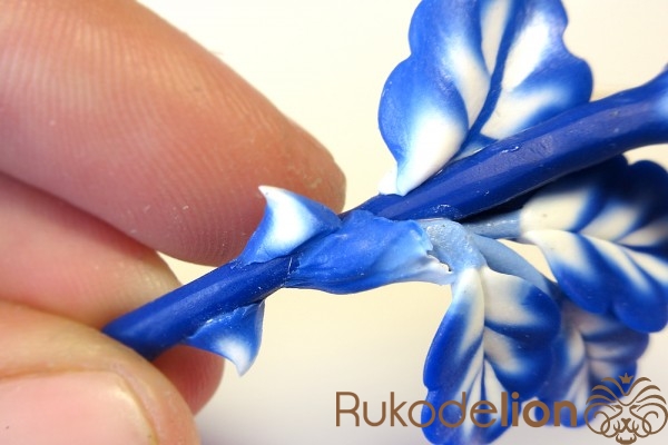 Сложите листья рядом друг с другом в нужном положении с осторожно слепите их стебли друг с другом. Теперь сформируйте еще один листик (в этот раз не запеченный) более крупного размера, чем предыдущие. Таким образом, у нас теперь есть три запеченных листа, один сырой, два шипа и деталь, которая будет закрывать собой место крепления листьев к розе.