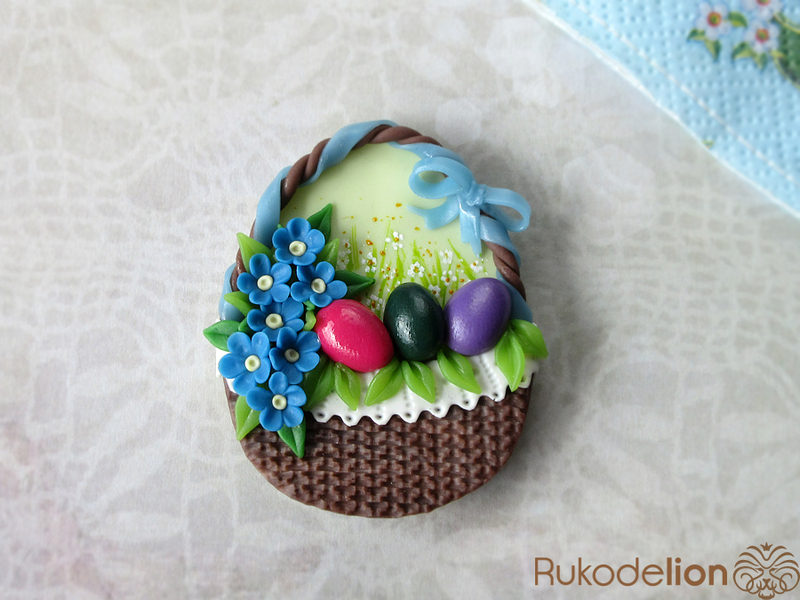 В преддверии празднования Пасхи предлагаю вам сделать красивый и оригинальный пасхальный магнит в виде корзинки с яичками и цветами из полимерной глины.