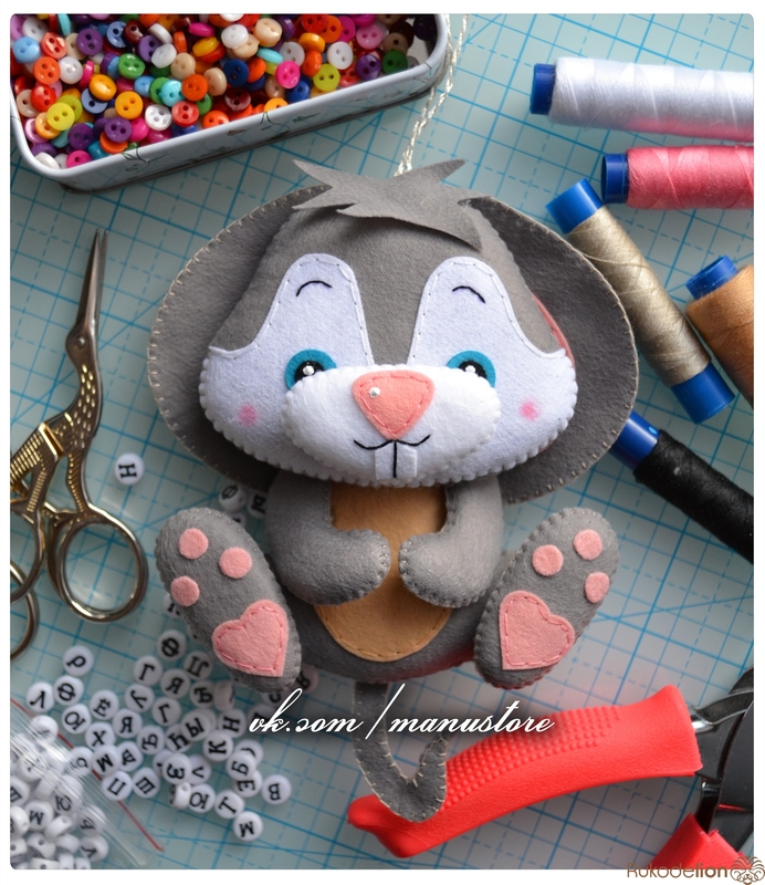 3. Инструменты и прочее: иголка, ножницы, синтепон, белая краска по ткани, румяна, пуговка, самоисчезающий маркер, клеевой пистолет со стержнем, клей "Момент Кристалл" (либо любой другой ваш любимый текстильный клей), пробойник по фетру и декоративный шнурок для подвешивания.