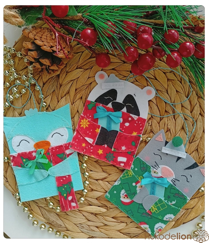 Из черного фетра вырезаем произвольные удлиненные треугольники (будущие полоски на голове у кота). Из розового - три треугольника, два маленьких и один побольше. У большого треугольника скругляем углы, чтобы получился носик. Из белого фетра вырезаем мордочку и полоску для шапки. Из мятного - квадрат (подарок), из голубого - шапочку. А также вырезаем синюю полоску