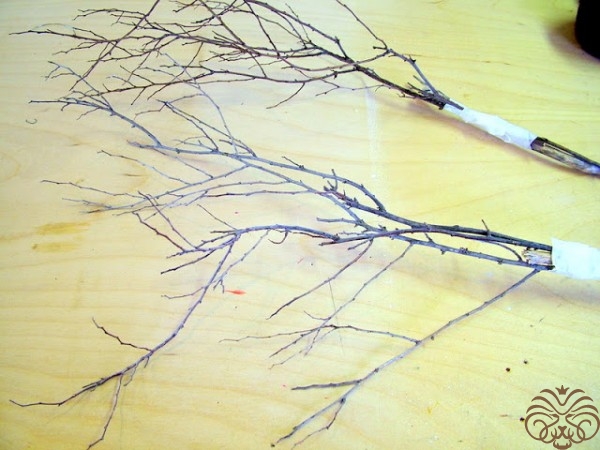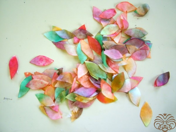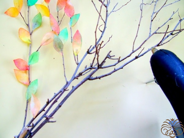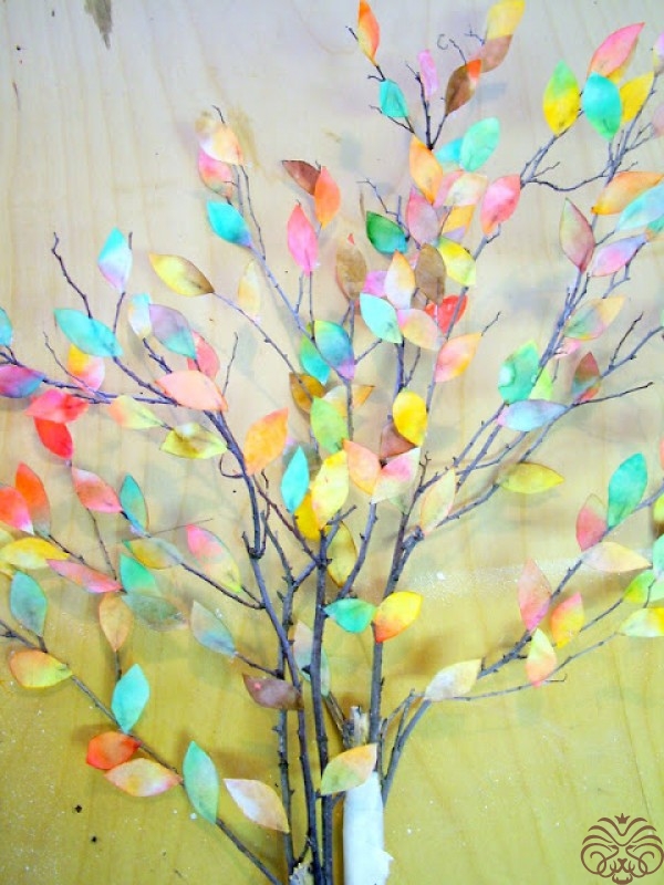 Для создания такого вот декоративного осеннего дерева необходимо взять бумажные фильтры для кофеварки, жидкие акварельные краски и газету. Расположите бумажные фильтры на газете, брызните на них воду и нанесите акварельные краски. Мы выбрали зеленые, желтые, оранжевые и коричневые цвета краски. Пока бумажные фильтры будут подсыхать, выйдете на улицу и соберите немного веточек деревьев или кустарников.