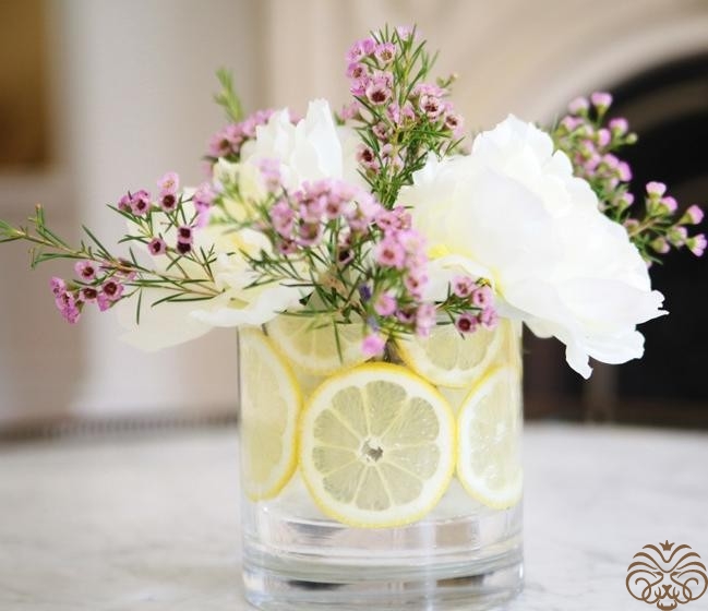 Далее поместите маленькую вазу в большую. Пространство между вазами заполните нарезанным ломтиками или тонкими слоями лимоном.