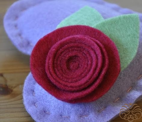 Далее на малиновом войлоке рисуем круг и вырезаем свиток (как показано на картинке). Закручиваем войлок из внешней стороны во внутрь, чтобы получился цветок.