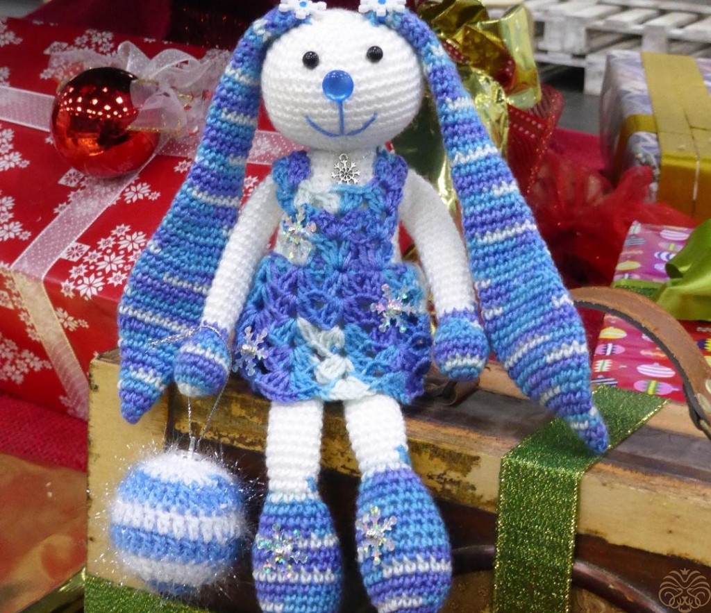 Зайка Снежинка связана крючком из микрофибры, наполнитель холлофайбер, украшена снежинками.