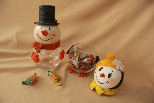 Удивительная пара друзей, пингвин и снеговик, порадуют любого сладкоежку в новый год. Шикарные конфетницы ручной работы выполненные из стекла, полимерной глины и расписанные красками, не оставят равнодушными ни кого.
