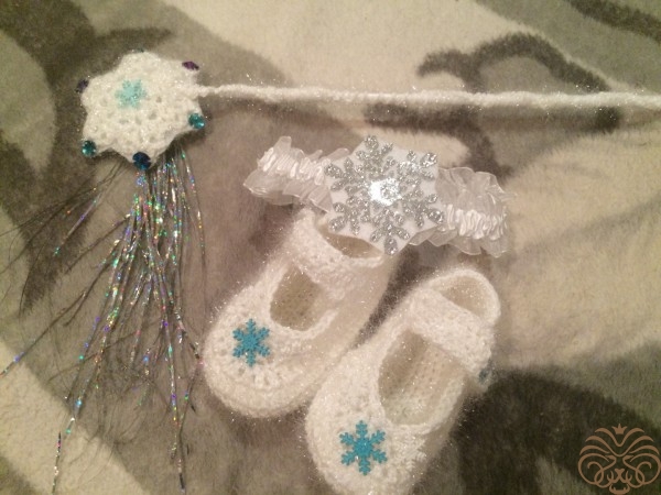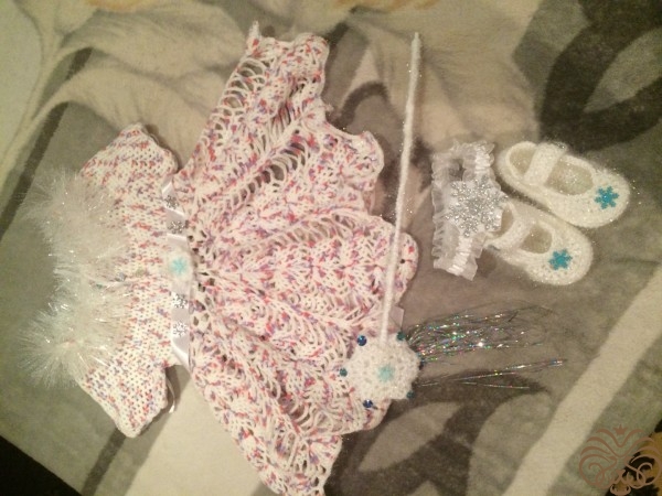 Платье "Снежинка" связанное крючком, тапочки крючком, волшебная палочка крючком и повязка на голову из фетра.