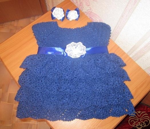 Платье для Снегурочки, детское, на девочку 1,5 - 2 лет. Связано пряжей - Акрил с блестками, для украшения пояса и резинок для волос использованы ленты и бисер.