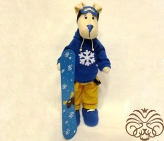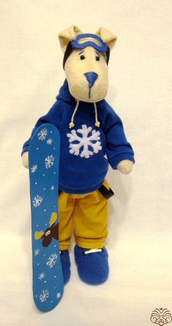 ღ♥ღМарина Шевченкоღ♥ღ, игрушка полностью сшита вручную. Сам пес выполнен из плюша, а в одежде использовался хлопок, трикотаж и флис. Снежинку вырезала из фетра и пришивала вручную. Сноуборд и маску тоже делала сама и раскрашивала красками. Из фабричного только репсовая лента, бусинки и люверсы на толстовке и обуви.
