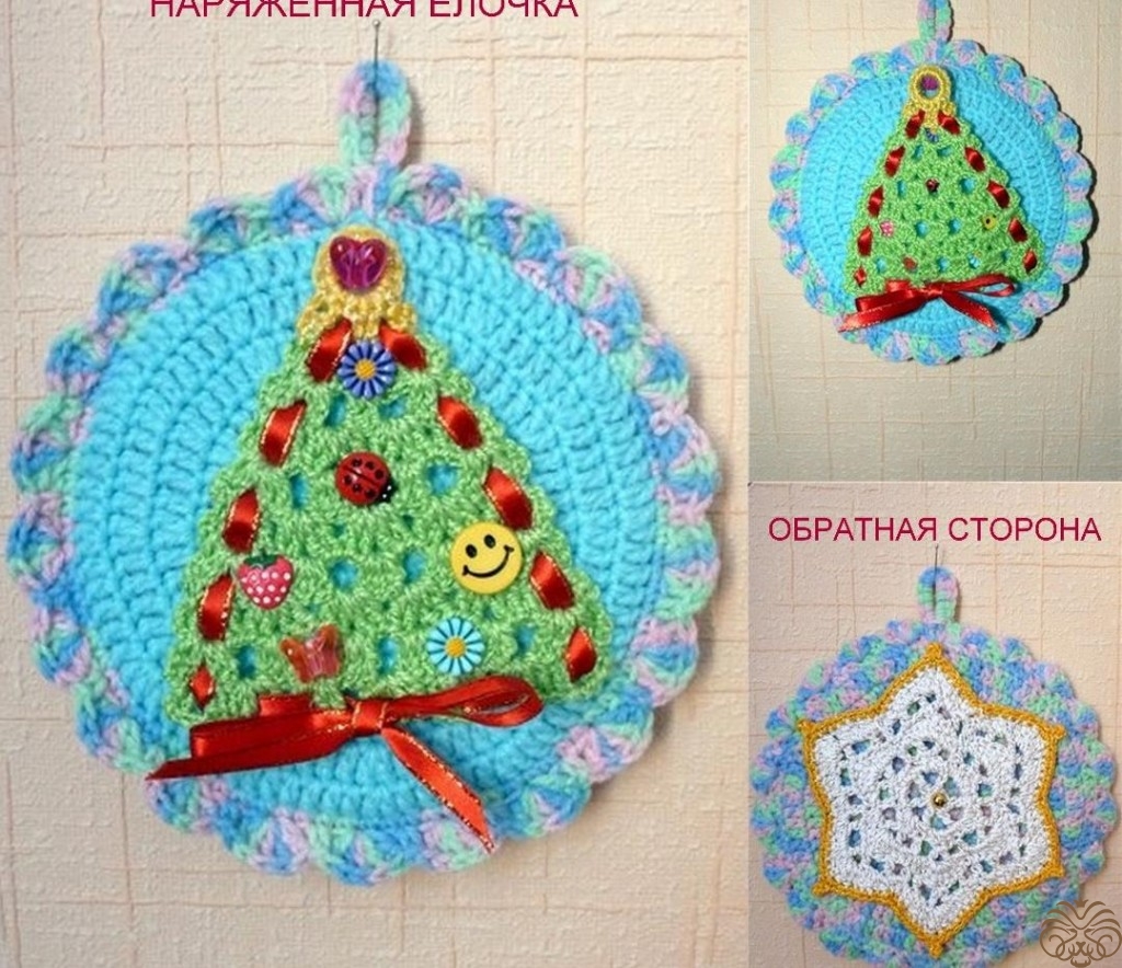 Обвязанный CD диск. Вязаная ажурная елочка, под ней пришиты разные пуговки.