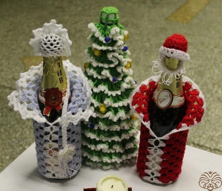 Акриловая пряжа зеленого, красного и голубого цвета, отделка акрил с люрексом. Связано крючком