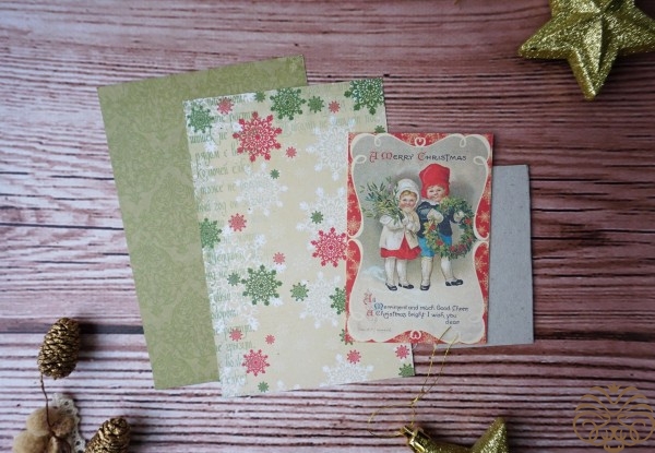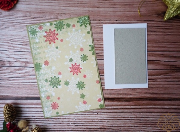 Я буду делать открытку в традиционных новогодних красно-зеленых тонах. Для основы я взяла два листочка из одной коллекции, один спокойной расцветки, другой с ярким принтом. Верхний слой необходимо сделать на пол сантиметра меньше нижнего. Также нам потребуется небольшая картинка в новогодней тематике, она должна быть в одной цветовой гамме с нашей основой.