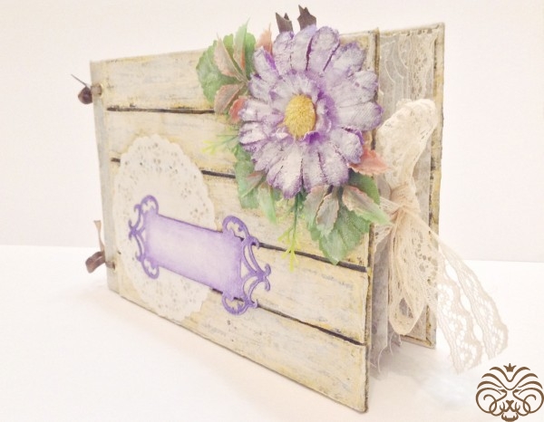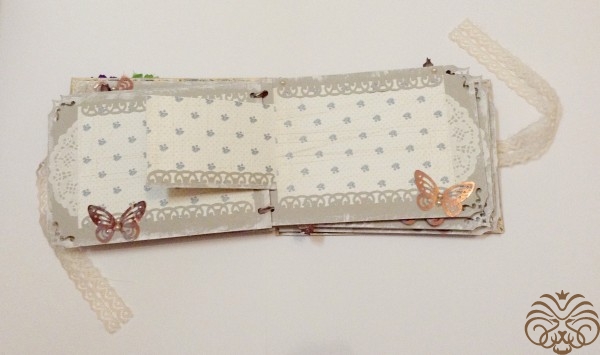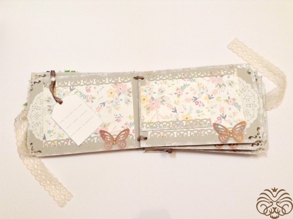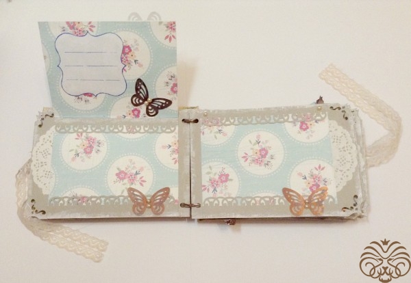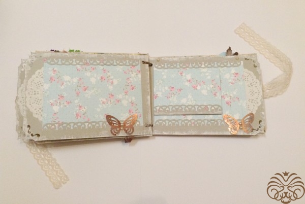 Мини альбом для фотографий. Первая моя проба стиля шебби шик. В альбоме 10 разворотов и все они декорированы разной дизайнерской бумагой, но в одном стиле. На обложке пустая рамка, чтобы владелец сам смог подписать альбом. Так же внутри есть секретные кармашки, развороты для дополнительных фото и теги для записей памятных дат.