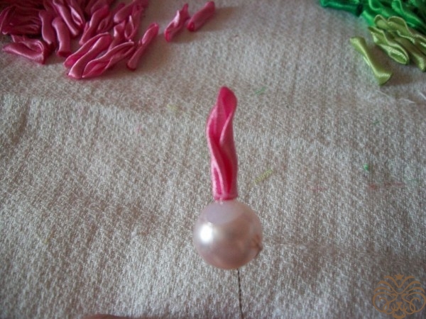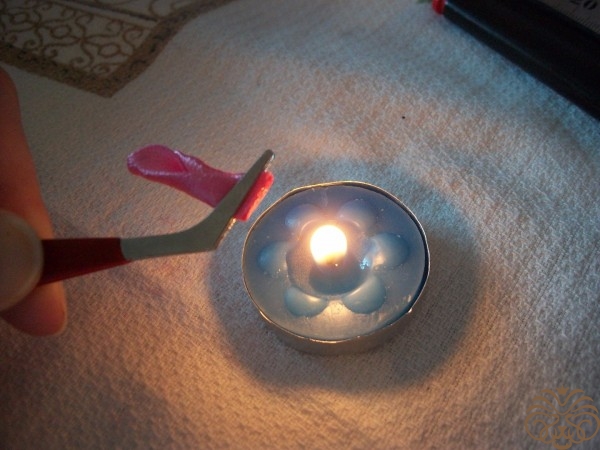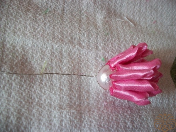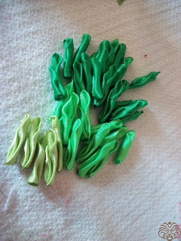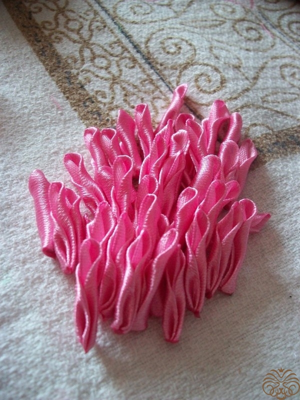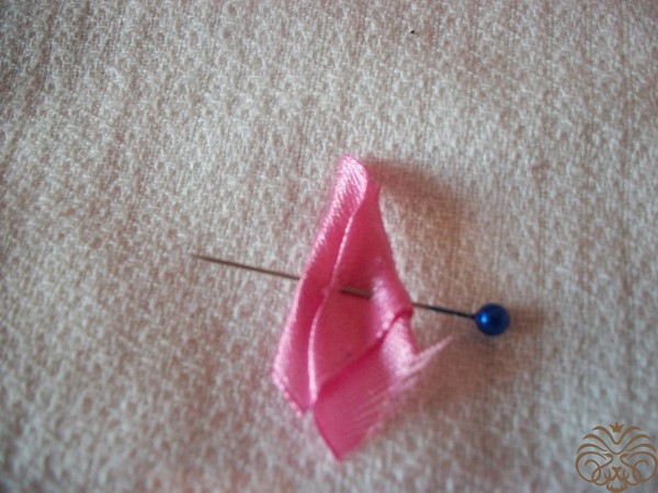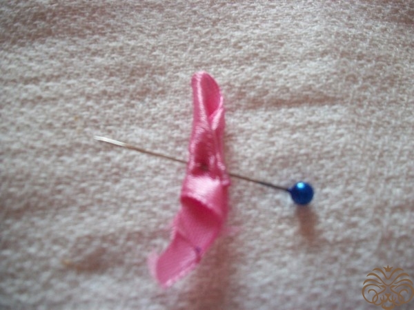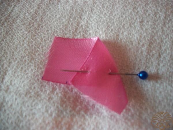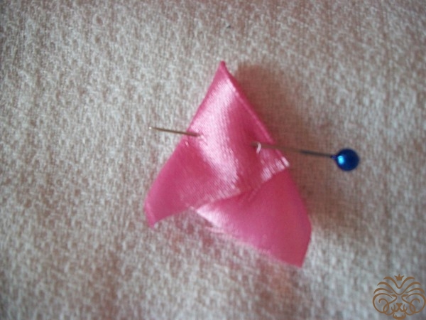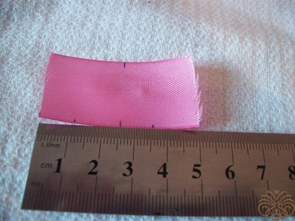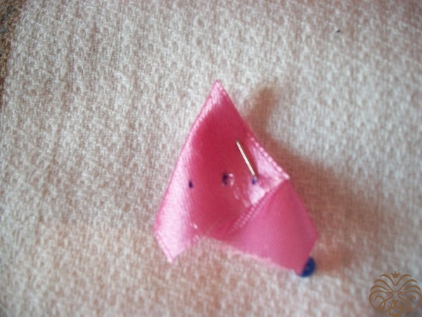 Теперь начинаем соединять стороны по нашим разметкам, сначала одну сторону, затем другую. Далее делаем еще разметки, как показано на фото и соединяем стороны по нашим разметкам, сначала одну сторону затем другую. Обрезаем лишнее и опаливаем край над свечкой. и так далее делаем нужное количество лепестков для цветка и листьев.