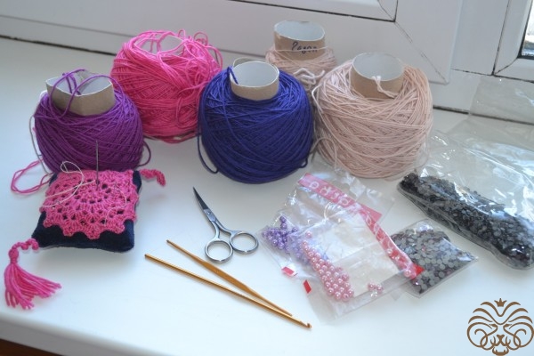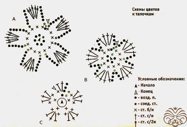 5. Вяжем цветочки крючком большие и маленькие в одну и две нитки, отпариваем (Смотри схему В. Вяжем 5 воздушных петель,замыкаем в кольцо, 3 петли подъема, пышный столбик,снова три воздушных петли, присоединяем к кольцу. Таким образом вяжем 5 лепестков)
