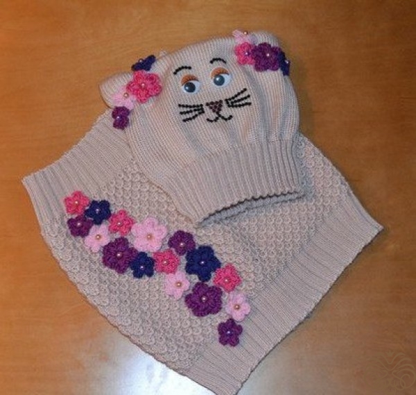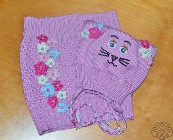 6. Сшиваем снуд, сшивает шапочку в виде квадрата. В углы вставляем синтепон, прошивает и чуть стягиваем шов чтоб получилось ушко.