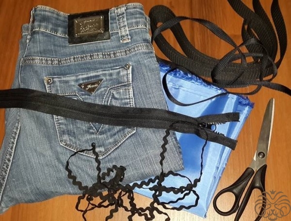 Для работы нам понадобятся: старые джинсы (необходимо, чтобы был целым хотя бы один карман и вся задняя часть брюк, в идеале - лейбл), кусок подкладочной ткани (примерно 50 на 50 см), репсовая лента разной ширины (в данной работе были использованы лента шириной 1 см - 20 см, и широкая лента 3 см - примерно 120 см), лента "змейка", молния от 20 см, ножницы, иголки, нитки в тон тканей, швейная машинка или оверлок с функцией стачивания.