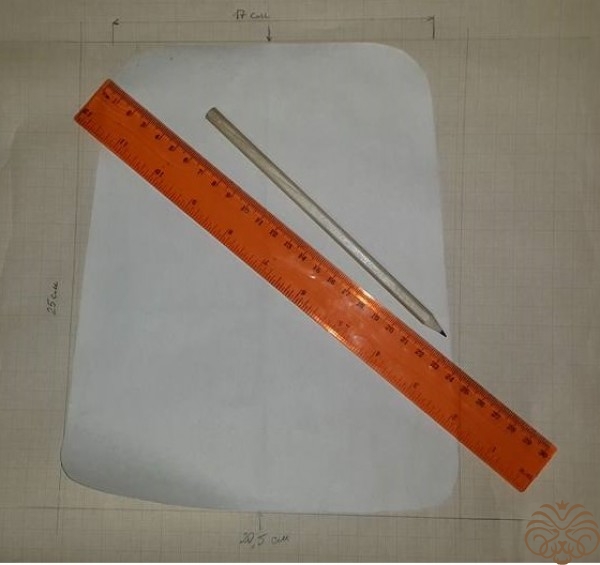Выкраиваем на бумаге равнобедренную трапецию: основание 20,5 см, верх 17 см, высота трапеции 25 см. Вырезаем из бумаги и закругляем края, лучше предварительно сложить вдвое, чтобы закругление было одинаковым с обеих сторон. Это выкройка лицевой части рюкзачка и его спинки. Для "рамки" замка строим выкройку прямоугольника 20,5x4 см. Для дна и боковых сторон будет одна деталь - прямоугольник 63x8 см.