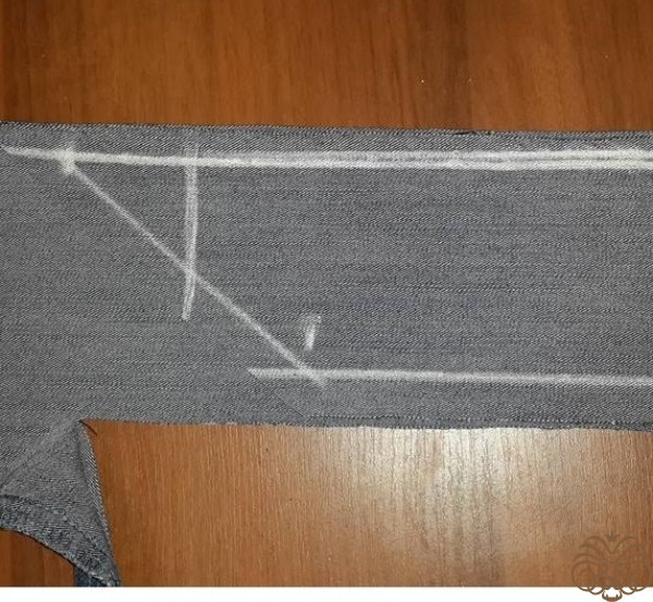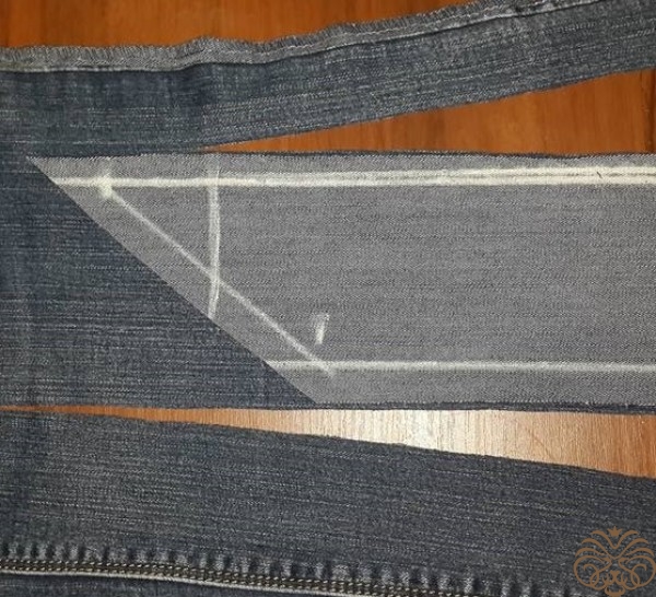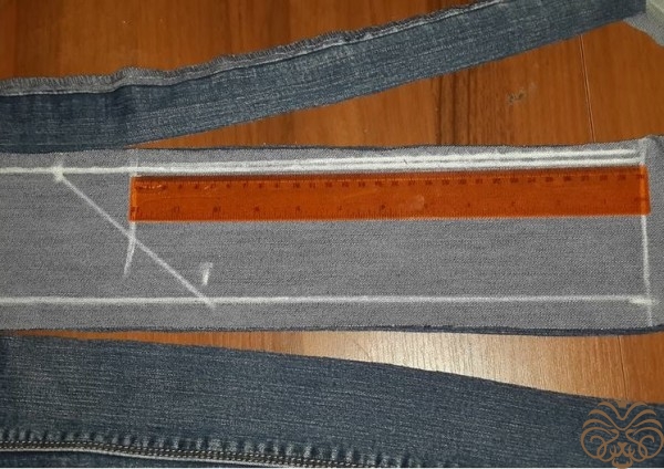 Выкроить эту деталь цельной весьма сложно - немного найдётся брюк в мире с достаточной длиной для этого)) Мой опыт подтверждает, что часть детали, как её не располагай, попадает на "колено", то есть самое растянутое и деформированное место брюк. Поэтому я выкраиваю две детали, которые посередине соединяю диагональю. Мы выкроим её вместе с вами прямо на джинсах. Итак, отмеряем и расчерчиваем половину детали, то есть прямоугольник 30x8 см. С одной стороны прямоугольника (на фото - слева) отмеряем от края влево 5 см наверху, и вправо 5 см внизу. Соединяем точки, получаем диагональ. Вырезаем - не забудьте прибавить по 1 см на припуски!
