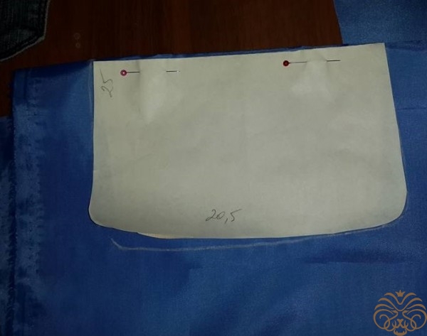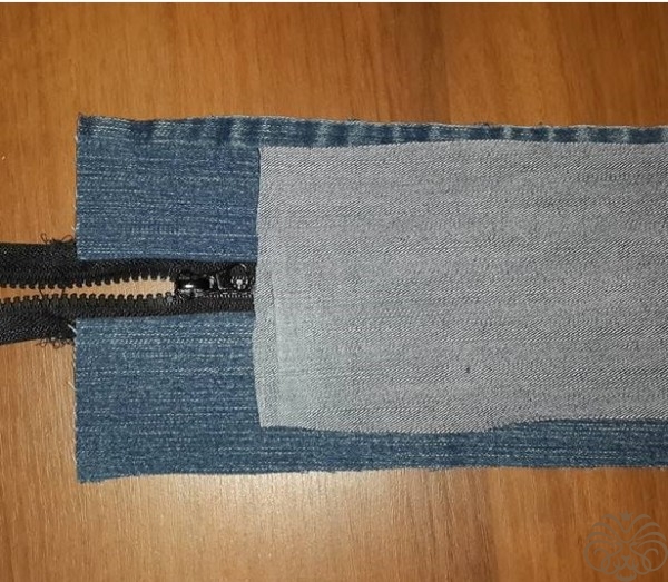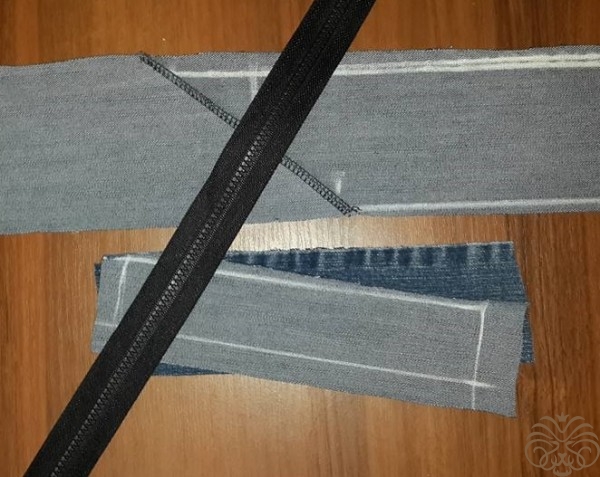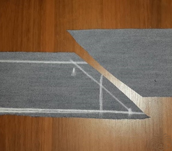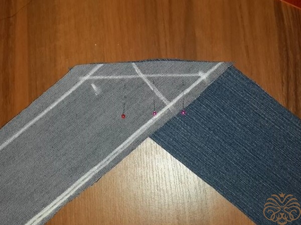 Переворачиваем полотно джинсов, выкраиваем точно такую же деталь, но НЕзеркально. Когда обе детали будут повёрнуты диагональю друг ко другу, их можно будет соединить в одно. Сколите их скосами, повернув относительно друг друга под углом 90 градусов и можно стачивать.