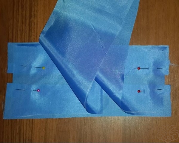 Теперь складываем лицевыми сторонами вшитый замочек и сторону дна-боковинок (по маленькой стороне). Скалываем, проверяем аккуратность и ровные срезы. Стачиваем.
