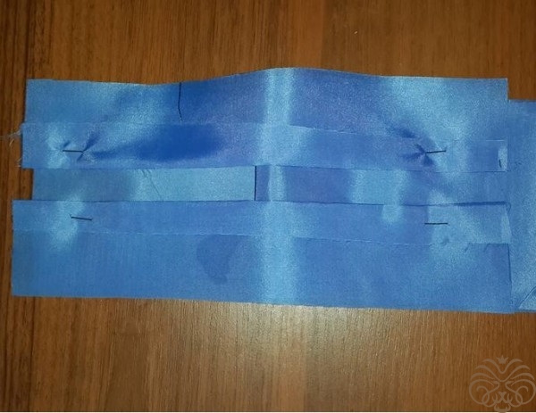 Протягиваем широкую ленту через лейбл. Вытянув ленту влево, ведём конец на себя слева направо и крепим строго вертикально к низу изделия. Тоже самое проделываем с другой стороны, зеркально. Мне кажется, фото здесь будет более понятным, чем моё описание ))