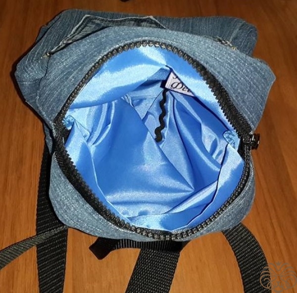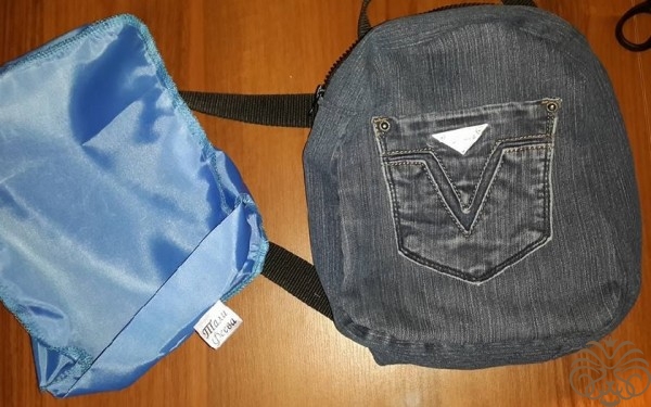 Выверните джинсовый верх, откройте молнию до конца. Подклад НЕ выворачивайте! Как есть вставьте её в джинсовый верх, совместите уголки, проверьте, чтобы спинка подклада (та, где кармашек) соприкасалась со спинкой рюкзачка (там, где лямки). Соответственно, лицевая сторона подклада (где наверное есть ваш ярлык) должен соприкасаться с лицевой стороной рюкзачка (где кармашек).