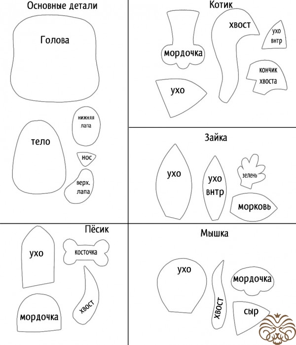 В каждом звере мы будем использовать основные детали из листа с выкройками, а также дополнительные детали в зависимости от животного. Т.е. чтобы сделать котика мы берем основные выкройки, а также выкройки под надписью "Котик". У всех животных основные детали одинаковые - меняется только цвет фетра, а вот изготовление головы немного отличается. В данном мастер классе я покажу подробно изготовление котика, а у остальных животных покажу те моменты изготовления, которые отличаются.
