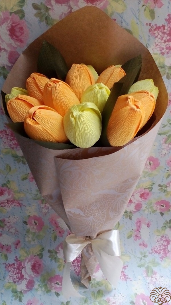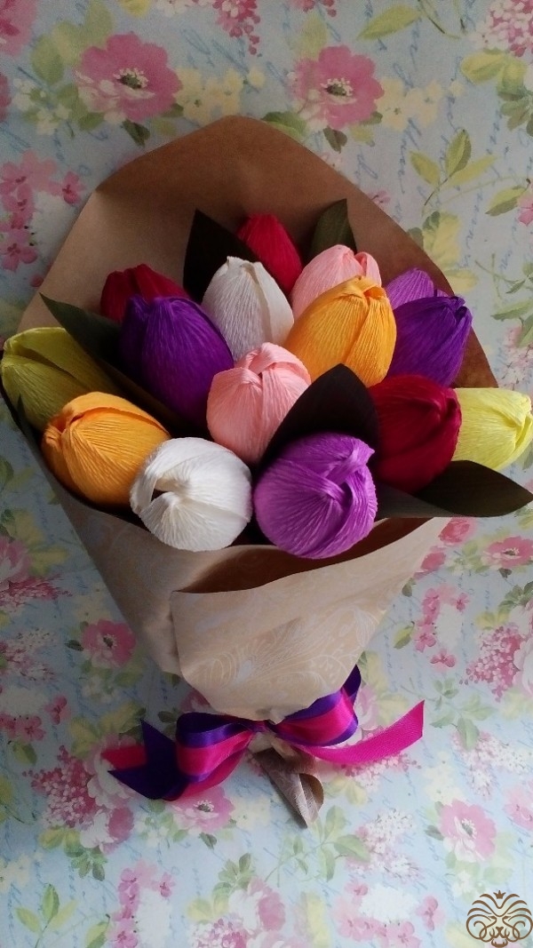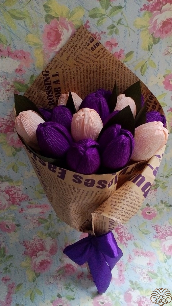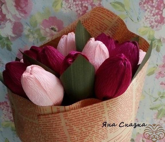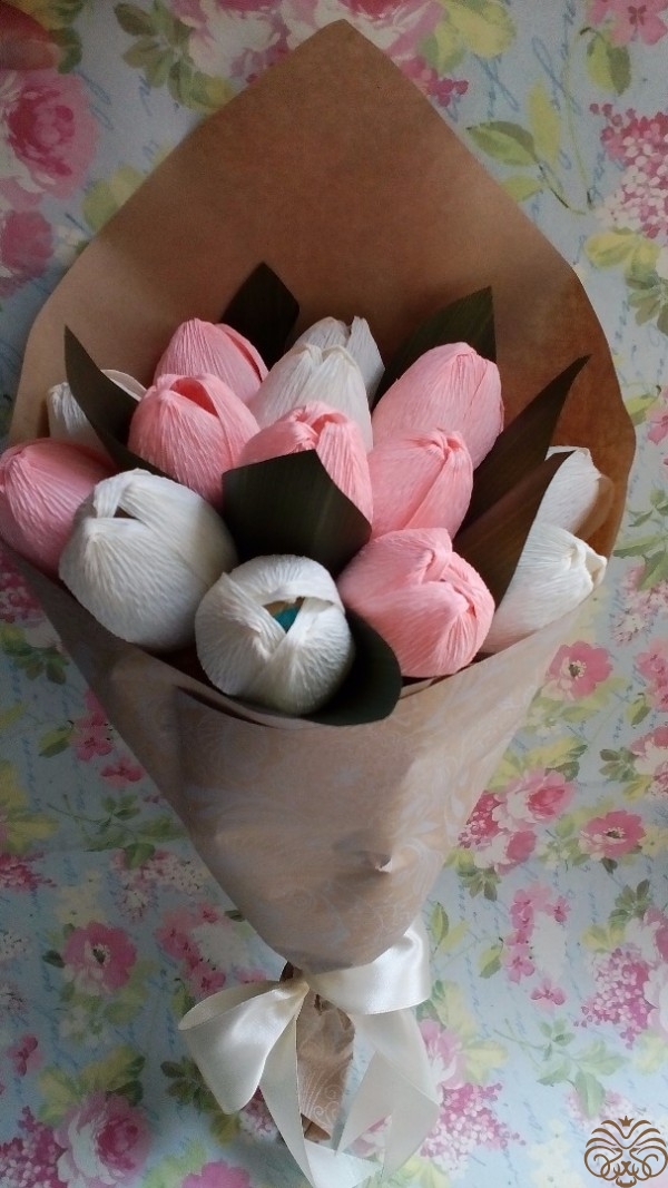 Цветы выполнены из креп-бумаги в нутри которых конфеты "Трюфель"