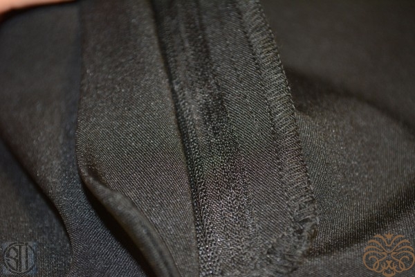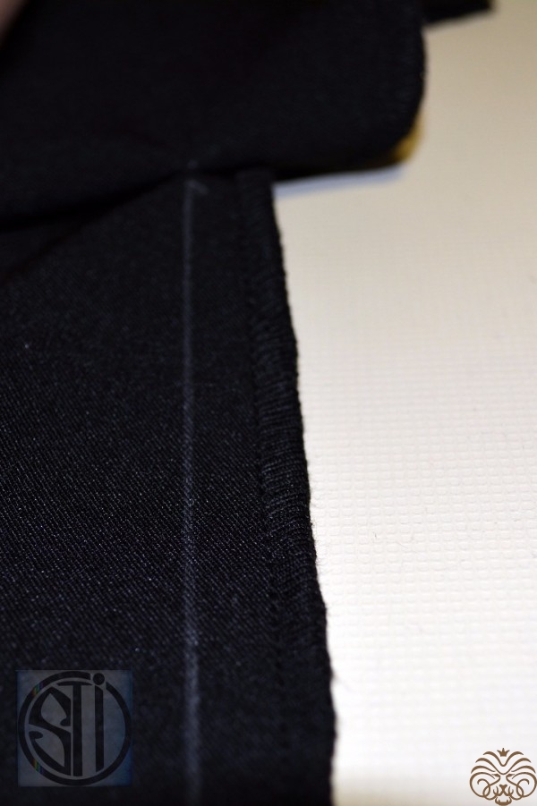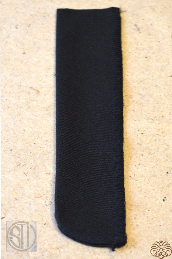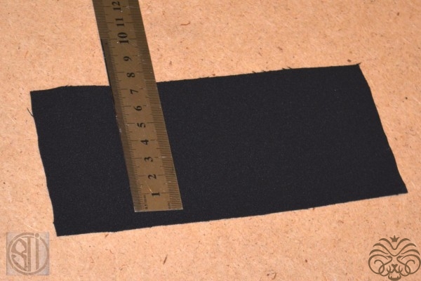 3. Откосок выкраивается: ширина гульфика (до линии середины переда)*2+2 см на припуски. Его дублируем. Заутюживаем пополам. Обтачиваем нижний край. Выворачиваем и обметываем срезы.