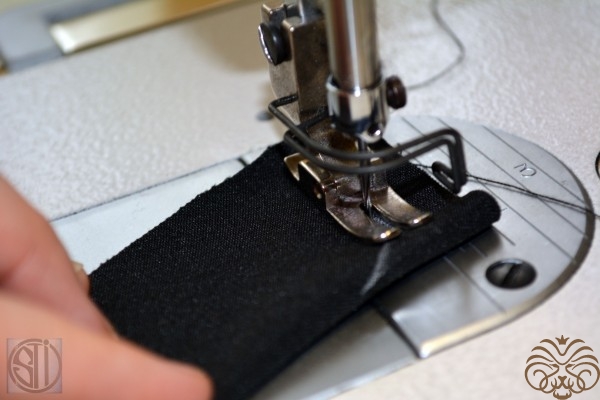 4. Брючную молнию располагаем  на откоске, уравниваем обметанный срез со срезом молнии и настрачиваем молнию на откосок.